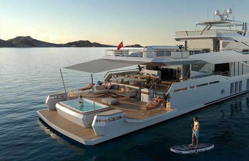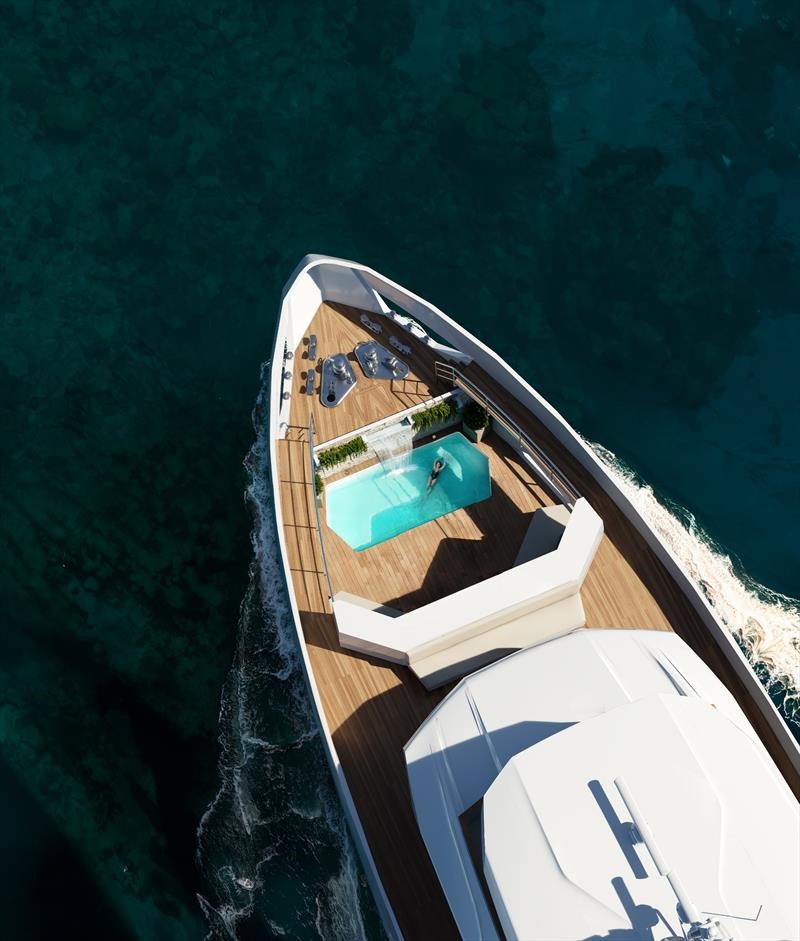 Jedna od najistaknutijih značajki 47MXP je redizajnirani krmeni dio i beach club, koji gostima omogućuju neposredan kontakt s morem. Prostrane terase, luksuzna lounge zona i bazen na krmi stvaraju atmosferu luksuznog mediteranskog resorta. Dodatni bazen smješten je na pramcu, dok sunčana paluba nudi bar i brojne prostore za opuštanje i zabavu. ​