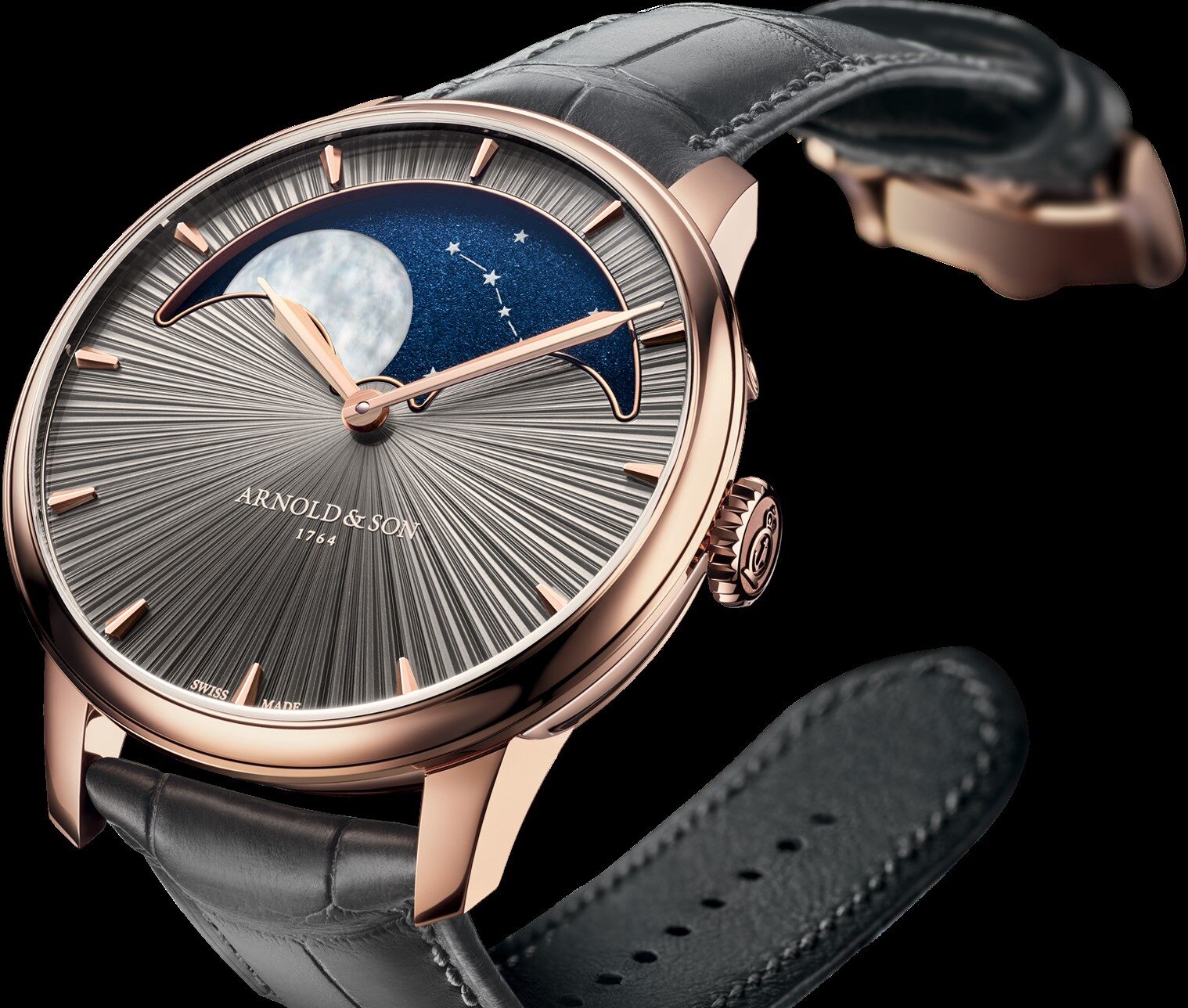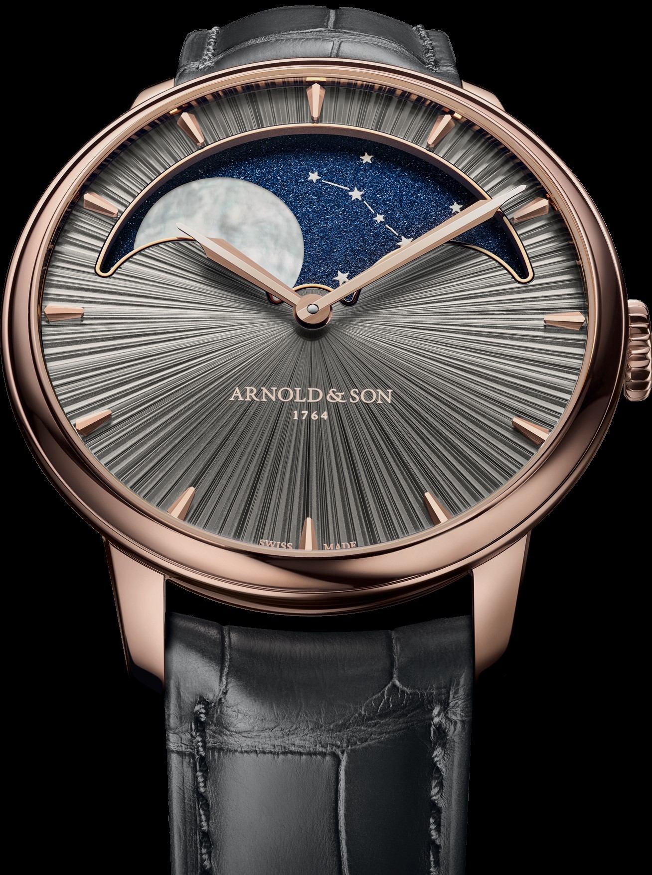 Novi Perpetual Moon 41.5 Cliff Grey evocira divlje litice Cornwalla, rodnog kraja Johna Arnolda, tvorca preciznih pomorskih kronometara. Dial u sivoj ‘stellar rays’ PVD obradi oponaša teksturu stijena osunčanih maglovitim svjetlom, a kroz njega proviruje impresivan mjesečev disk promjera 29 mm – jedan od najvećih u svijetu satova.