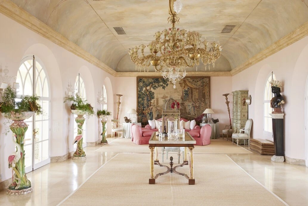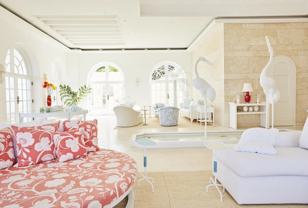 U unutrašnjosti dominiraju bogato uređeni saloni sa ručno obojanim muralima francuskog umjetnika Jean-Claude Adenina, koji je tri godine radio na umjetničkim stropovima i zidovima, što cijeloj vili dodaje dozu kontinentalnog glamura. Stil uređenja uključuje pozlaćeni namještaj, klasične paravane i tapiserije koje evociraju palače jezera Como ili Versailles.