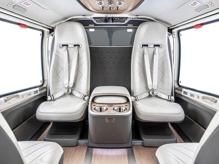 Kabina može primiti između četiri i osam putnika, a kupci mogu birati između šest dizajnerskih koncepata interijera, od diskretno elegantnih do sportskijih konfiguracija. Materijali uključuju visokokvalitetnu kožu, drvene površine i metalne detalje, stvarajući atmosferu koja podsjeća na interijer luksuzne limuzine ili privatnog jet salona. Prostor je koncipiran otvoreno, s naglašenim oblim linijama i pažljivo integriranom rasvjetom, dok panoramski prozori dodatno naglašavaju osjećaj slobode u letu.