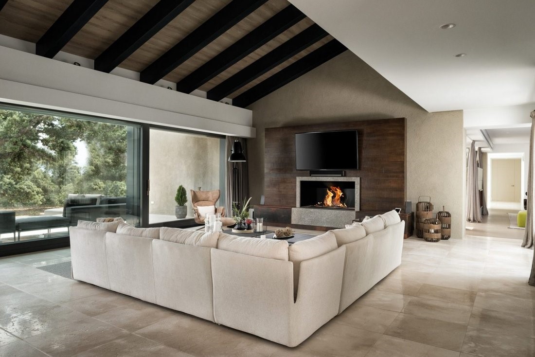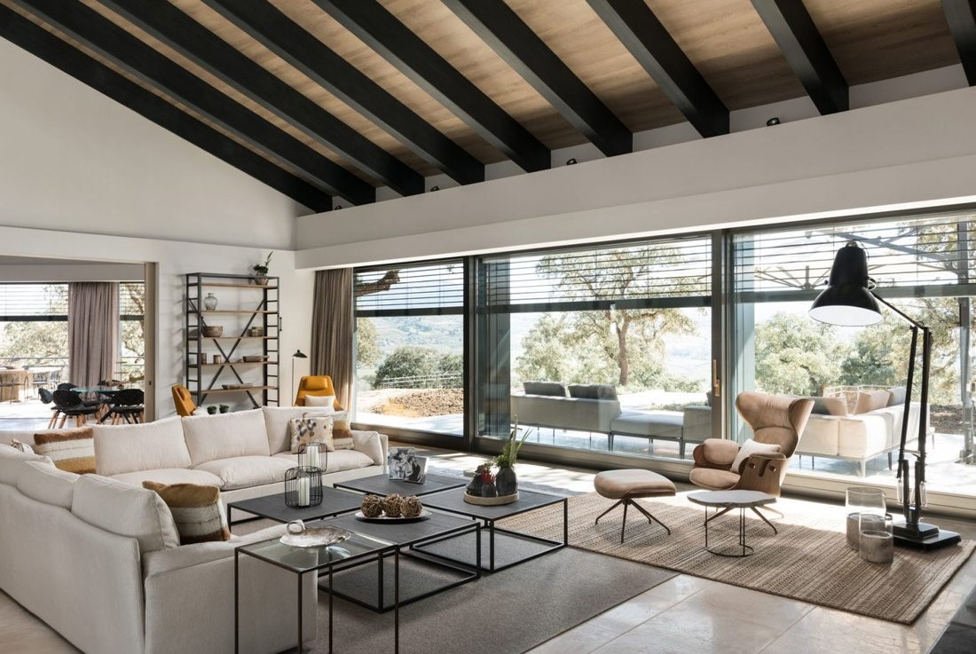 Interijer vile razvijen je kao produžetak krajolika. Velike staklene površine od poda do stropa otvaraju pogled prema planinama i vinogradima, dok prirodno svjetlo postaje ključni element dizajna. Prostor od 1.172 četvorna metra osmišljen je kako bi ponudio ravnotežu između elegancije i udobnosti. Dnevni boravci, blagovaonica i kuhinja povezani su u otvorenu cjelinu, s naglaskom na druženje i zajedničke trenutke. Posebnu atmosferu stvara kuhinja s velikim rustikalnim stolom, koja postaje središnje mjesto okupljanja, prostor gdje gastronomija prelazi u iskustvo.