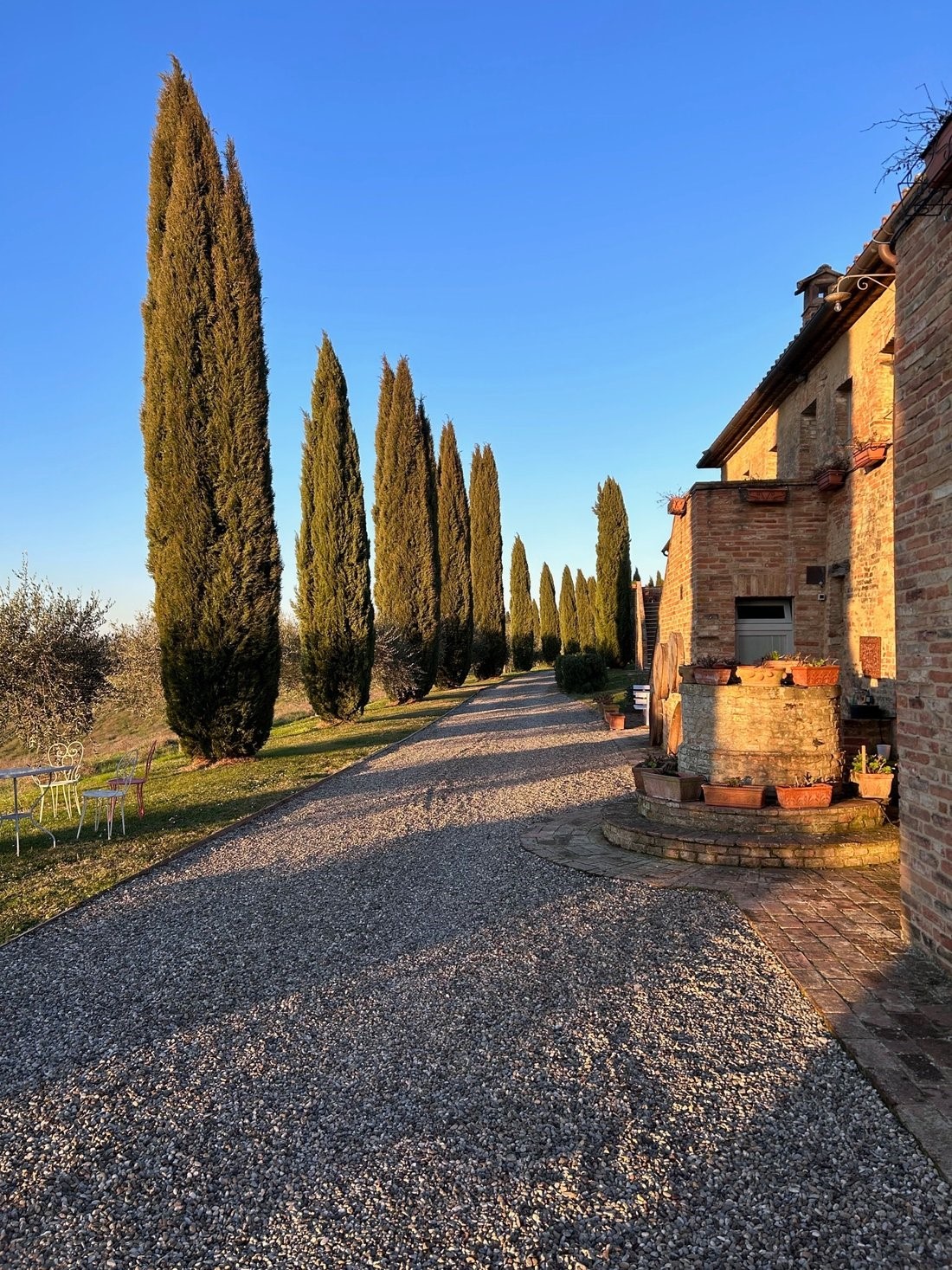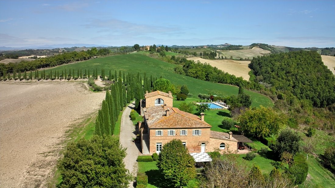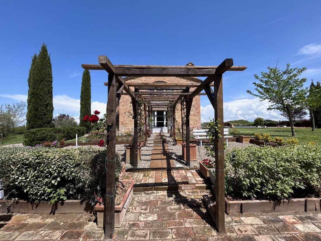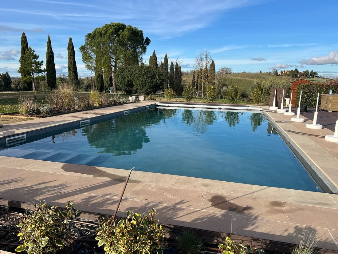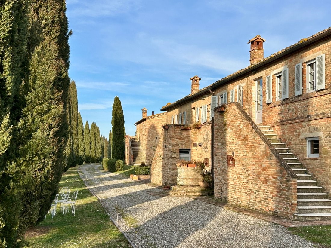 Do glavne kuće vodi aleja čempresa, gotovo arhetipski toskanski motiv, ali ovdje bez pretjerane scenografije. Kuća se otkriva postupno, kroz vrtove, pergole i otvorene prostore koji prirodno prelaze iz interijera u eksterijer. Panoramski bazen (12 x 6 metara) pozicioniran je tako da ne dominira prostorom, već ga nadopunjuje. Pogled prema valovitim brežuljcima oko Siene ostaje glavna točka fokusa.