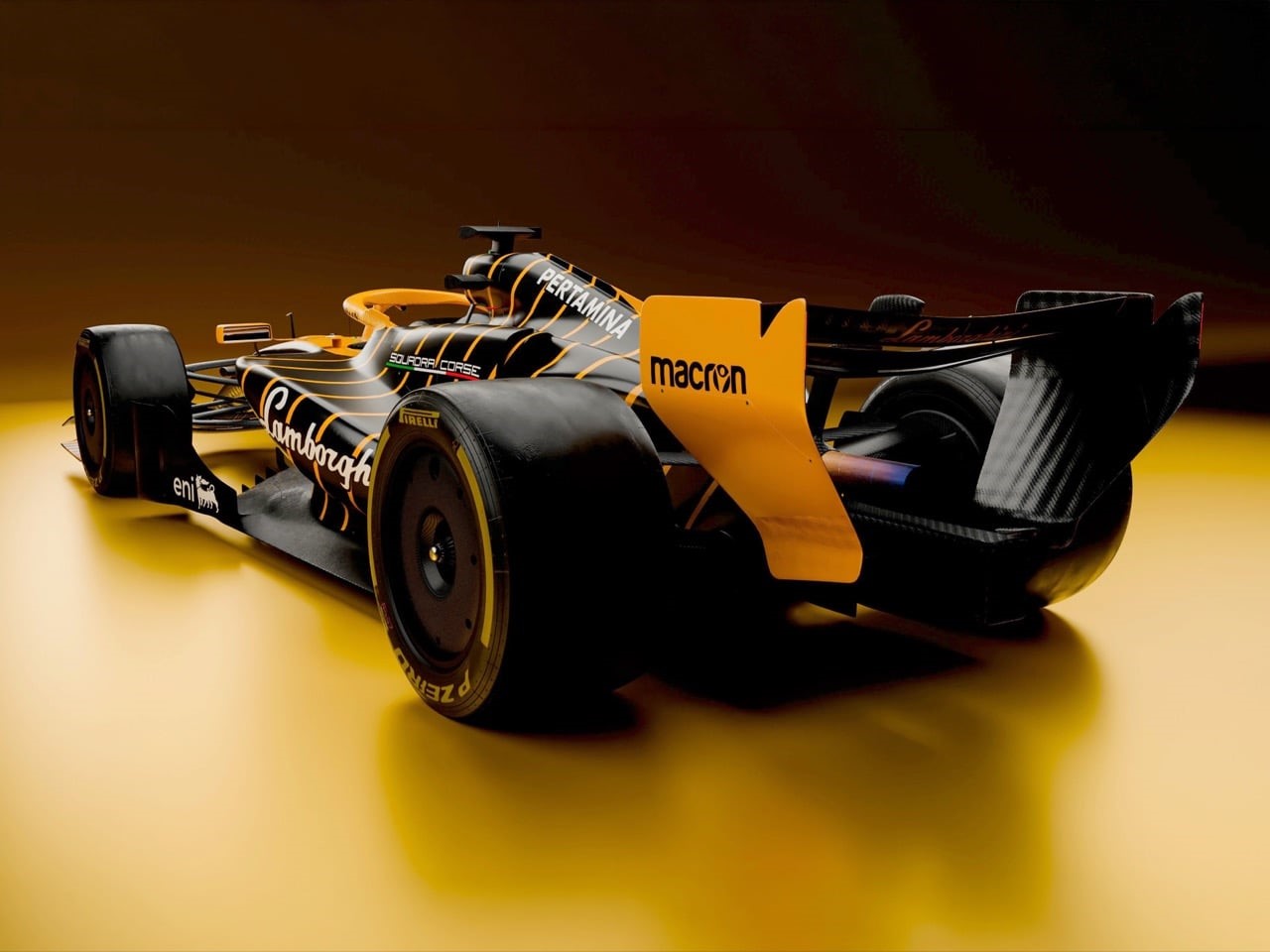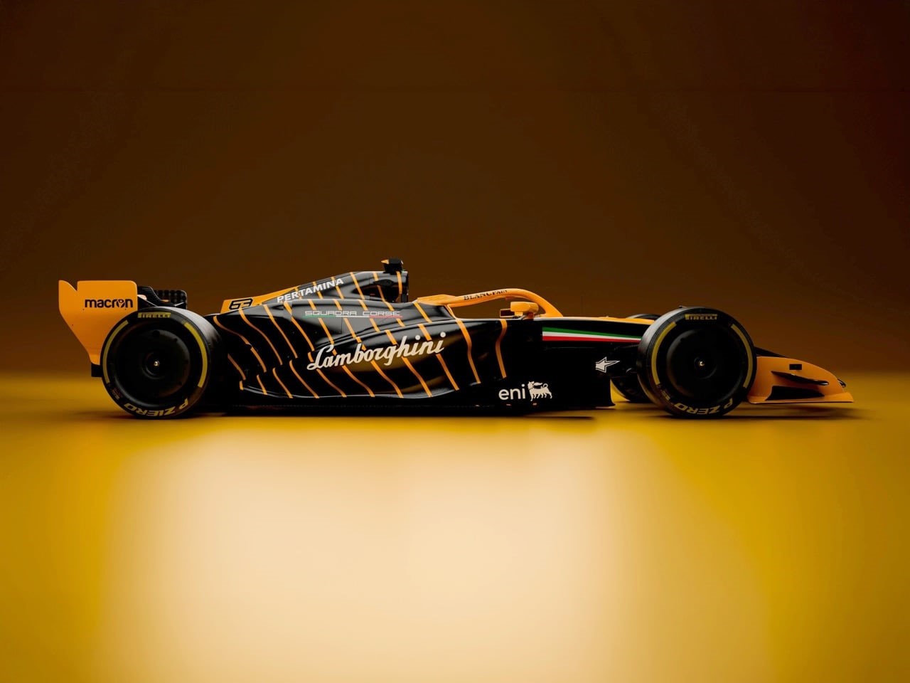 Rodriguez ne pokušava učiniti F1 bolid “Lamborghinijem” u doslovnom smislu. Ne postoje V12 proporcije, nema teatralnih elemenata superautomobila. Umjesto toga, koristi ono što je suštinski: boje, grafiku i vizualni jezik. Dominantna Arancio Borealis narančasta, između rastaljene lave i industrijskog signala, uparena je s dubokom crnom kako bi naglasila aerodinamičke površine, a ne ih prikrila. To nije dekoracija. To je interpretacija.